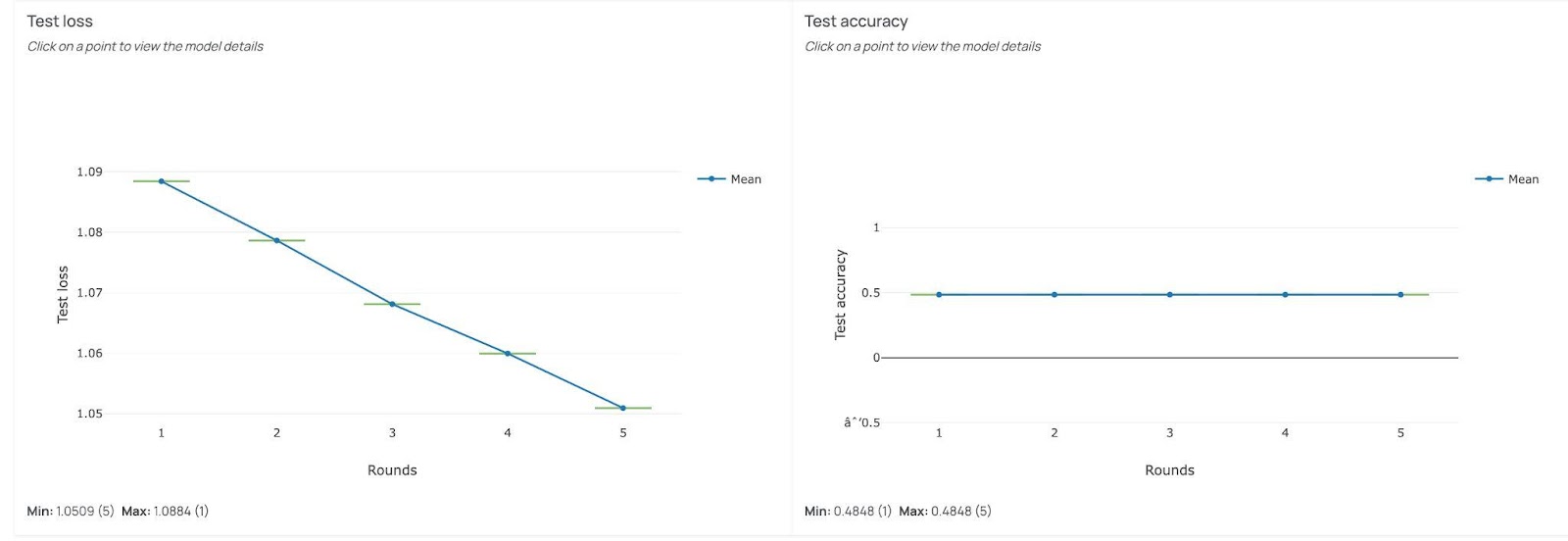 In the first setup, only one site participated. The model’s accuracy stayed around 50%, even though the training loss was marginally decreasing (y-axis). With limited and homogeneous data, the model couldn’t learn enough to make reliable predictions.