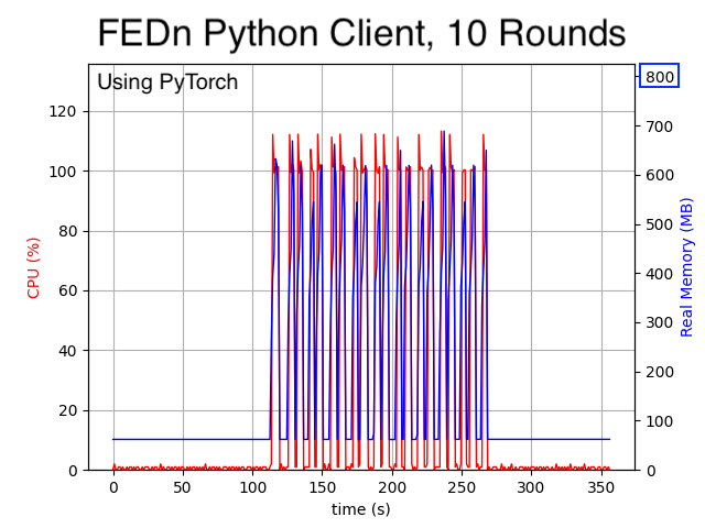 Python Client (PyTorch): During training, the CPU usage spikes to nearly 100%, indicating that one full CPU core is being fully utilized. Memory usage also increases significantly, rising from under 60 MB to a peak of around 700 MB. This sharp increase reflects the intensive computational and memory demands of training neural networks using PyTorch. The consistent high CPU usage suggests that Python is effectively leveraging available resources to handle the workload, but at the cost of higher memory consumption.