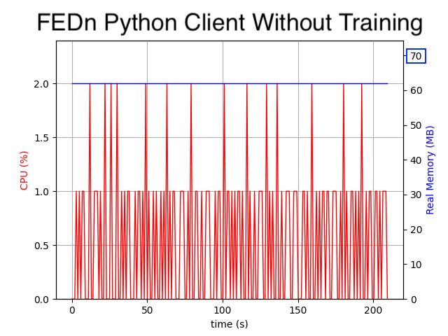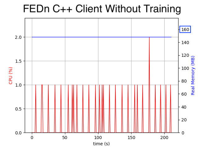 C++ Client: The C++ client shows higher memory usage in the idle state, staying under 160 MB, despite having minimal CPU usage (0-2%). This is not expected, this is due to how C++ compiles, links build executable. The higher memory footprint is attributed to the libraries used in the C++ implementation, such as LibTorch and cnpy, which may have some initialization overhead even when no training is being performed.