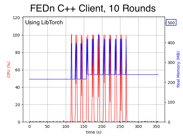 C++ Client (LibTorch + cnpy): Similarly, the C++ client shows CPU usage close to 100%, indicating that it is also fully utilizing one CPU core during training. The C++ client exhibits more frequent white spaces in the CPU usage plot, indicating that it completes tasks more quickly and spends more time idle between tasks. This suggests that the C++ implementation is more efficient in processing and requires less continuous CPU usage. However, memory usage behaves differently compared to Python. While the C++ client starts with a higher memory footprint in the idle state (under 160 MB), its memory consumption does not rise significantly during training, peaking at around 450 MB. This is a stark contrast to the Python client, where memory usage is more than ten-times during training. The stability in memory usage for the C++ client is attributed to the libraries used: