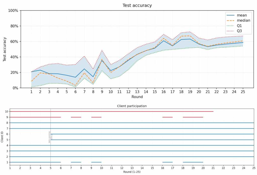 Across 180 experiments, results highlighted that static aggregation rules were often insufficient. In heterogeneous or imbalanced client setups, malicious updates could slip through, especially if attackers joined later in training.