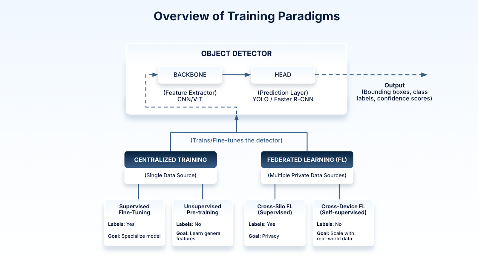Figure 1: A comparison of centralized vs. federated learning methods for training a modern object detector.